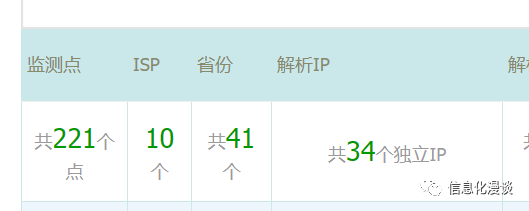 通过详细的测试数据,通过221个监测点的主动访问数据,我们看到该网站解析出了34个独立IP,说明该网站一定使用了CDN业务。
