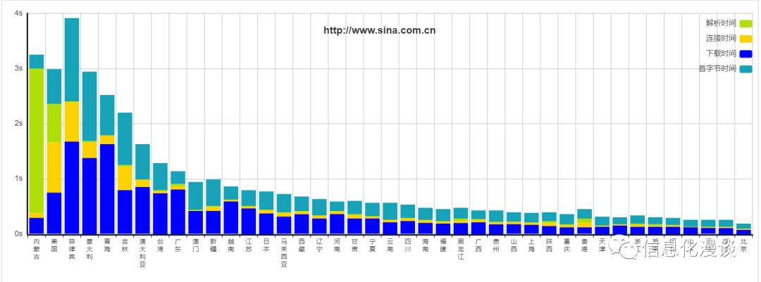 我们还能得到不同省的业务访问数据的排序,如下图,北京用户访问体验最好,美国、菲律宾等客户的访问体验最差。