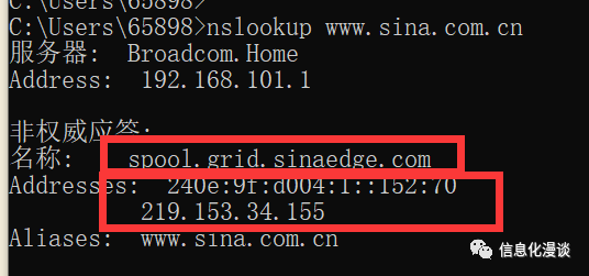通过nslookup命令,我们验证该域名被指向spool.grid.sinaedge.com这个CNAME节点,该节点也是CDN的服务地址。最终该次请求被解析到了ipv4、ipv6 CDN的服务器地址。