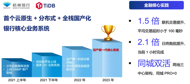 2023 年 11 月,TiDB 助力杭州银行新一代核心系统成功投产。杭州银行的资产规模约为 1.6 万亿,在中国银行排名在二十名左右。新核心系统是业内首个实际投产的云原生、分布式、全栈国产化的银行核心系统,标志着杭州银行核心业务系统实现完全自主可控和架构升级。