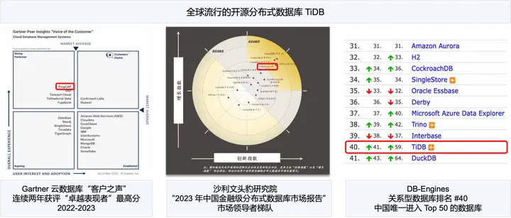 作为一款广受全球用户青睐的开源分布式数据库,TiDB 赢得了国际社会的广泛认可。在 2022 和 2023 年,TiDB 连续两年入选 Gartner 云数据库“客户之声”,获评“卓越表现者”最高分。在沙利文头豹研究院发布的“2023 年中国金融级分布式数据库市场报告”中,TiDB 跻身市场领导者梯队。在 DB-Engines 最新 4 月的关系型数据库榜单中,TiDB 排名第 40 位,是中国唯一进入 Top 50 排名的数据库。