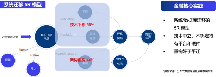 系统迁移 5R 模型为系统迁移规划提供了三个主要途径:平迁、改造迁移和新架构重构。调研数据显示,金融行业采用技术平移方式的比例为 56%,而采用新系统架构重构方式的比例为 44%。根据我们服务大量金融客户的经验,对于构建金融核心系统而言,平迁并非最佳选择。平迁虽然看似简单直接,但往往无法为业务带来显著收益。因此,在进行系统迁移决策时,应结合业务需求的主线进行综合考量。