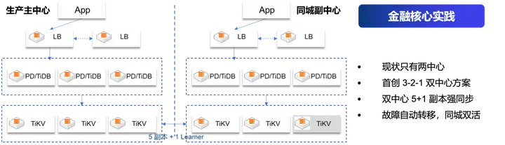 TiDB 在业界率先实现了银行核心系统的分布式数据库双活架构,为金融机构的业务连续性提供了坚实的保障。分布式数据库通常需要三中心部署才能实现双活,但对于大部分金融机构而言,由于数据中心地理位置限制,难以满足三中心部署条件。TiDB 创新性地推出了“3-2-1”双中心架构,在生产主中心部署 3 个 TiKV 节点,在同城副中心部署 2 个 TiKV 节点和 1 个 Learner 节点。该架构以更低的成本实现同城双活,已在多家银行成功落地。