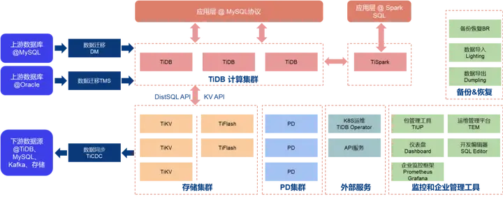 TiDB 是一款自主研发的原生分布式 HTAP 数据库,为金融机构打造了高性能、高可用、弹性扩展的现代化数据基础设施,其架构设计有以下特点:第一,存算分离,解决了高性能、高并发和在线扩容问题,且不依赖于特定的硬件和云平台。第二,TiKV 行存和 TiFlash 列存来应对 OLTP 和 OLAP 场景需求,TiSpark 提供大数据处理能力。第三,数据三副本机制,天然具备集群级的高可用。TiDB 提供了多种数据迁移工具,支持 MySQL 和 Oracle 数据库的平滑迁移。通过 TiCDC 同步工具,TiDB 的数据可同步至 MySQL、Kafka、对象存储等。此外,TiDB 还提供丰富的监控和企业管理工具,构建了一个完善的数据库技术生态。