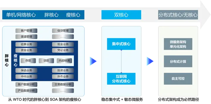 分布式架构已经成为银行核心转型的必然路径。 在早 期 WTO 时代,银行核心系统采用胖核心架构,将记账、数据分析、审计、监管等多种功能集成在一个系统中,以满足银行全面的业务需求。 随着金融业务的复杂性和多样性不断提升,传统胖核心架构难以满足敏捷性和弹性需求。 银行逐步转向采用瘦核心架构,将核心业务功能与非核心业务功能分离,以 SOA 架构为基础,把非核心业务功能模块化,通过服务接口进行调用,提升了系统的灵活性和可扩展性。