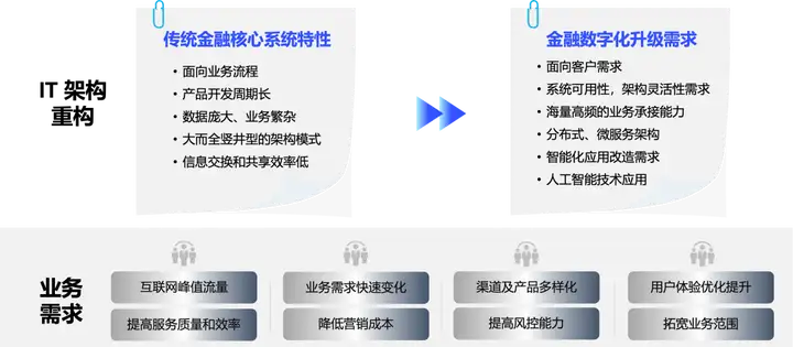 业务需求和 IT 架构是银行数字化转型的双轮驱动。传统金融核心系统以技术为中心,面向业务流程,产品开发周期长,数据庞大且业务繁杂,信息交换和共享效率低。而金融数字化升级需求则以用户为中心,强调架构的灵活性、敏捷性和海量业务的承接能力。以互联网支付处理为例,业务需求的快速变化如何承接?渠道和用户的体验如何优化?营销成本如何降低?IT 基础设施的升级重构是银行数字化转型成功的关键。银行需要构建一个敏捷、弹性、数据驱动、安全可靠的 IT 基础设施,以满足业务需求和数字化升级的需求。