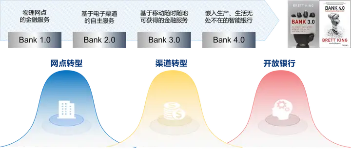 随着金融科技的兴起,银行业正面临着深刻的变革。知名金融科技专家和作家布莱特·金(Brett King)在多部著作中提出,银行经历了四个发展阶段:1.0 网点银行,以物理网点为中心提供基本的存贷款服务;2.0 渠道银行,拓展线上渠道,例如 ATM、网上银行、手机银行等;3.0 平台银行,基于移动随时随地获得金融服务;4.0 开放银行,嵌入生产、生活,无所不在的智能银行。当前,中国银行的业务发展呈现出三浪叠加的态势:从 1.0 到 2.0 做网点转型,2.0 到 3.0 做渠道转型,3.0 到 4.0 做开放银行的转型。