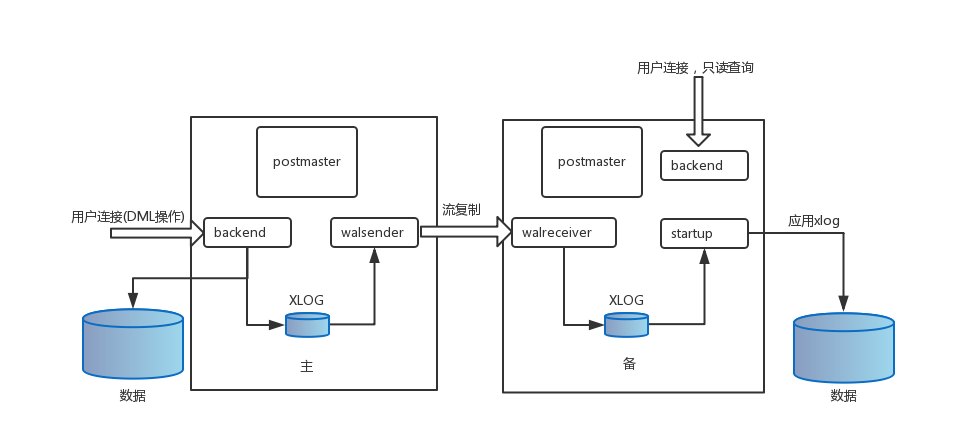 流复制是基于WAL物理复制,WAL (Write-Ahead Logging) 日志记录数据库的变化,格式为二进制格式,当主机出现异常断电时,如果WAL文件已经写入成功,但还没来得及刷新数据文件,当数据库再次启动时会根据WAL日志文件信息进行事务前滚,从而恢复数据库到一致性状态。