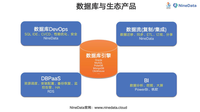 例如,NineData 专注于数据库 DevOps 和数据复制,而 DBPaaS 则提供云上数据库托管运维服务,包括备份、高可用性等,最常见的产品形态是 RDS,BI 领域主要是报表等数据分析产品,如 PowerBI、帆软等。