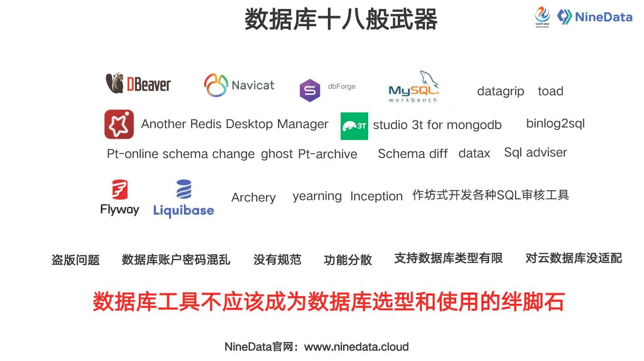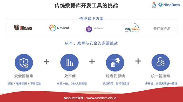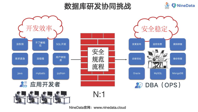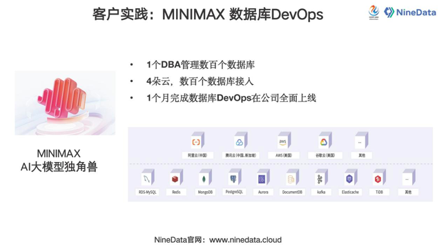 接下来,我将详细介绍我们公司所研发的产品——NineData。依托过去我在阿里巴巴多年技术理念的延伸,我们致力于将其转化为一款通用的市场解决方案。NineData自三年前成立以来,通过持续创新,坚持以提升安全与效率为核心设计理念。在数据库领域的 DevOps,数据安全至关重要,它与应用需求有所不同,因此我们在 NineData 产品设计中格外关注这一平衡。