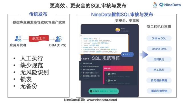 NineData 的新解决方案是基于智能 SQL 审核与发布流程,它能够自动检测代码中的安全风险,评估其对数据库的影响,并在设定的时间内执行,无需 DBA 实时监控。