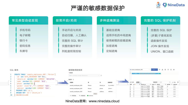 因此,在 NineData 的系统中,我们自主研发了 SQL Parse 组件,支持 Oracle、SQL Server、PostgreSQL 等多种数据库,这是一项艰巨且技术密集型的工作。我们的重点不仅在于检测,更在于防止代码通过不当方式暴露敏感数据,这是我们视为核心安全技术的关键部分。
