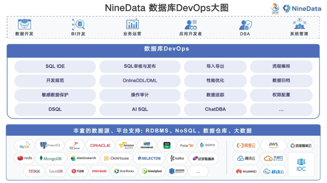在 NineData 的 DevOps 体系中,我们展示了强大的一站式能力概览。我们的系统旨在兼容各类数据库,鉴于当今市场繁多的选择,特别是国产数据库的兴起,我们了解到许多企业可能需要同时管理十几个不同的数据库,这在现今环境中已相当常见。为此,NineData 深度整合了60种主流数据库,确保覆盖了市场的广泛需求。