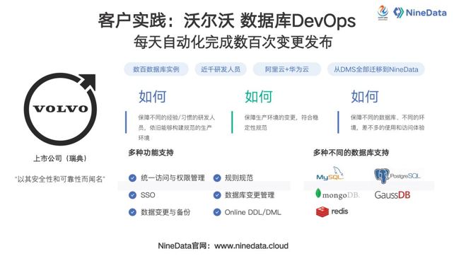 因此,沃尔沃选择转向 NineData。该平台的优势在于其全面支持多云和混合云环境,显著提升了数据库管理的效率。据统计,他们每天有数百次的变更和发布任务,都在 NineData 上自动化执行,这使得仅有的几位 DBA能更专注于高价值的工作,显著提高了开发团队的生产力。