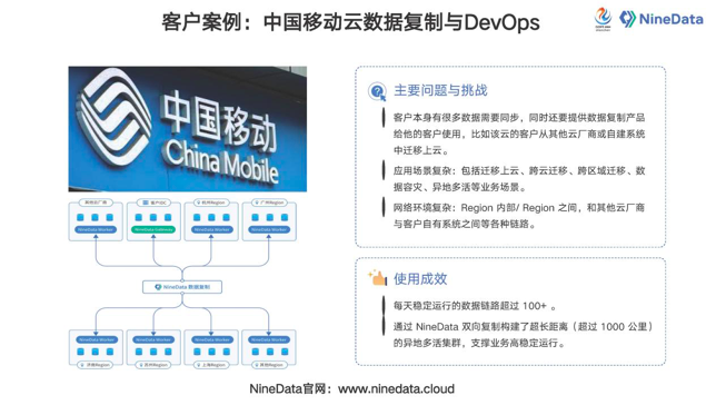 第三个案例涉及中国移动。除了使用 NineData 的 DevOps 工具外,中国移动云重点是使用了 NineData 的数据复制功能。由于其移动云服务涵盖约30多个区域,这些区域的数据库需要相互连接。