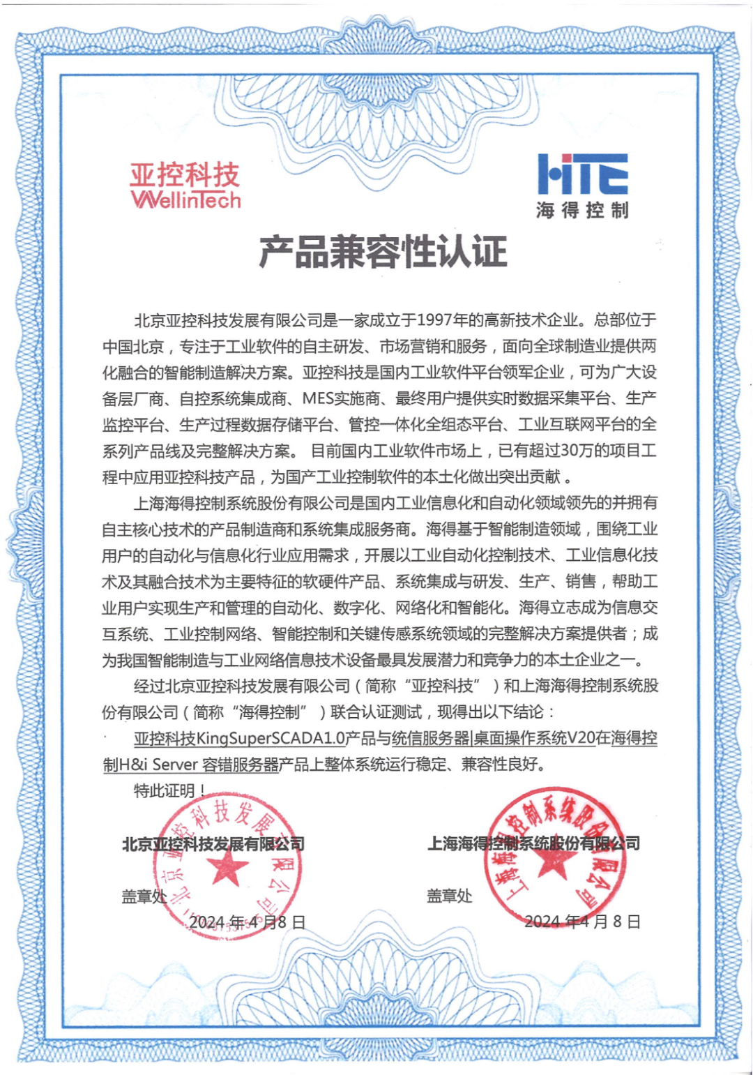 亚控科技作为国内SCADA软件平台的领军企业,公司自主研发的KingSuperSCADA高端工业自动化监控组态软件系列产品近期与上海海得控制系统股份有限公司系列产品联合进行认证测试。