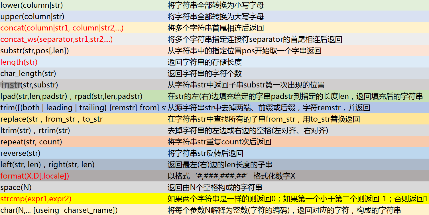 21、STRCMP(expr1,expr2):如果两个字符串是一样的则返回0;如果第一个小于第二个则返回-1;否则返回1