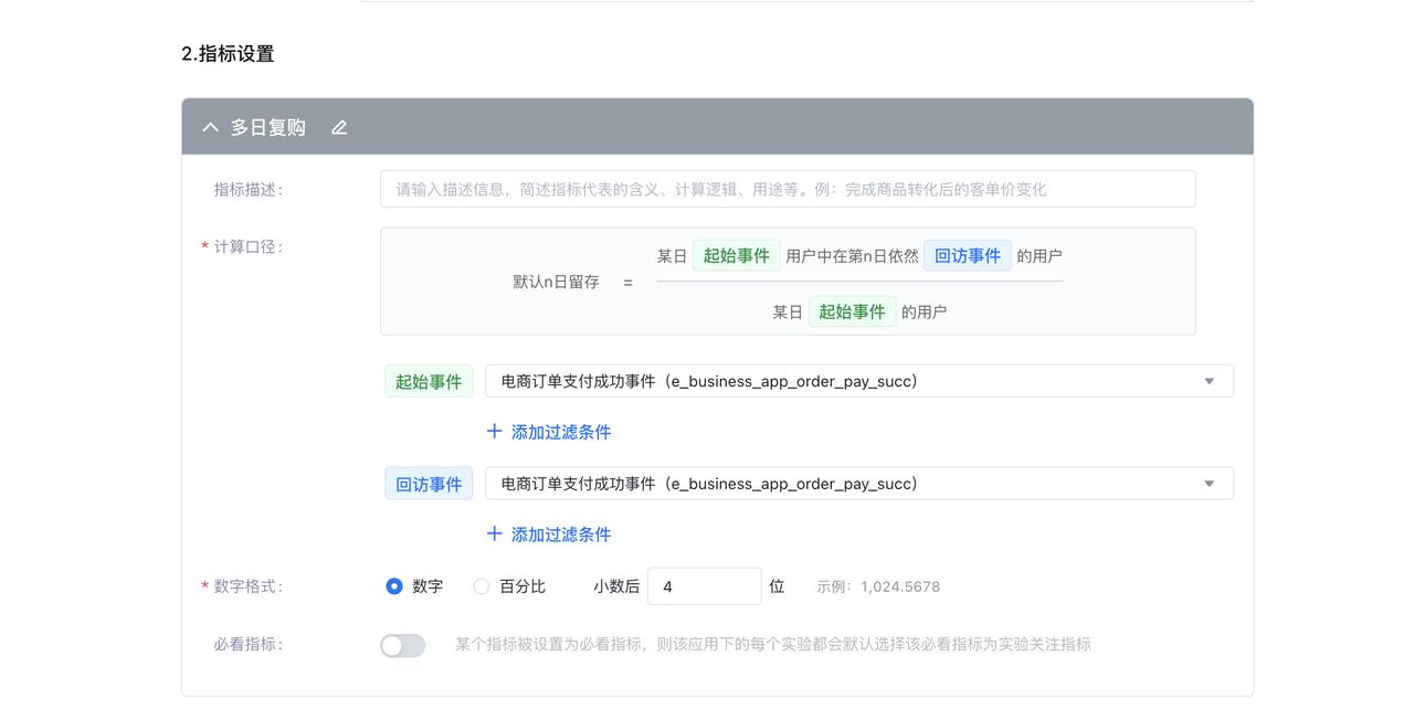 留存指标比传统的“应用登录留存率”更广义,它可以计算第二个事件相对第一个事件按天的留存率,包括购买留存率(复购)、访问某个功能的留存率等。DataTester中这一功能的加入,使得企业能够更全面地了解用户的留存情况,为优化产品功能和提升用户体验提供了有力支持。