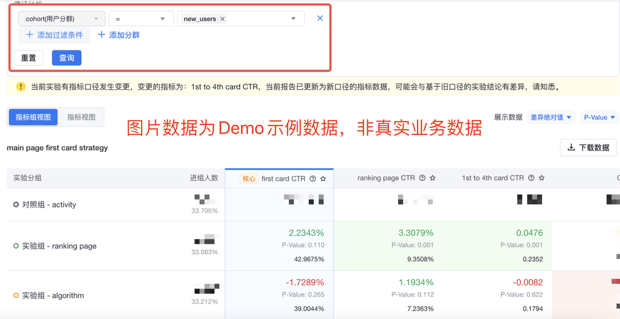 同时,在过滤了用户分群后,可以支持实时计算p-value和置信区间。
