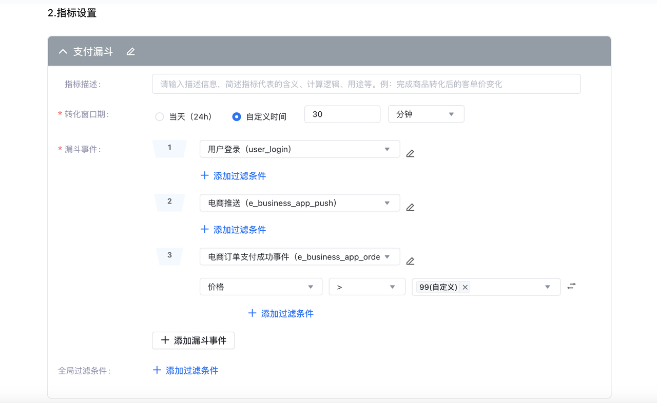 漏斗指标则是将一系列事件发生按顺序排列,判定一个用户在此顺序下发生这些事件,到达最后一步的转化率。这一指标类型对于基于流程场景的优化具有交大帮助,能够帮助企业精准定位影响用户转化的关键因素。