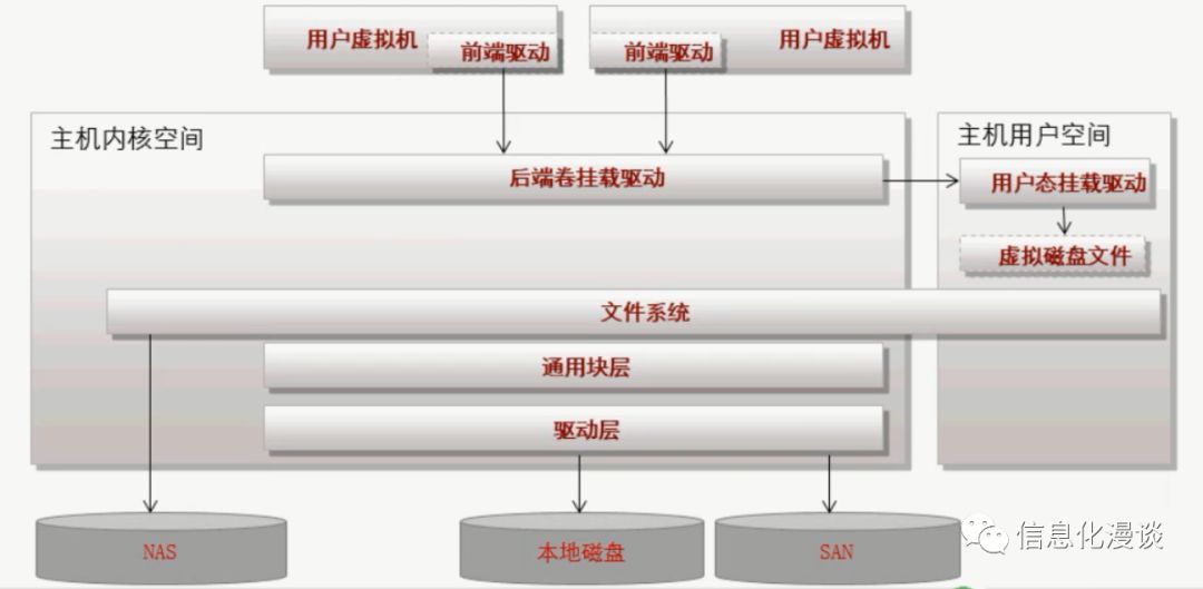 如下图可知,在虚拟化存储结构中,虚机以磁盘文件形式存在文件系统中。SAN的格式化格式为VIMS、本地磁盘格式化为EXT4、NAS自带文件格式。