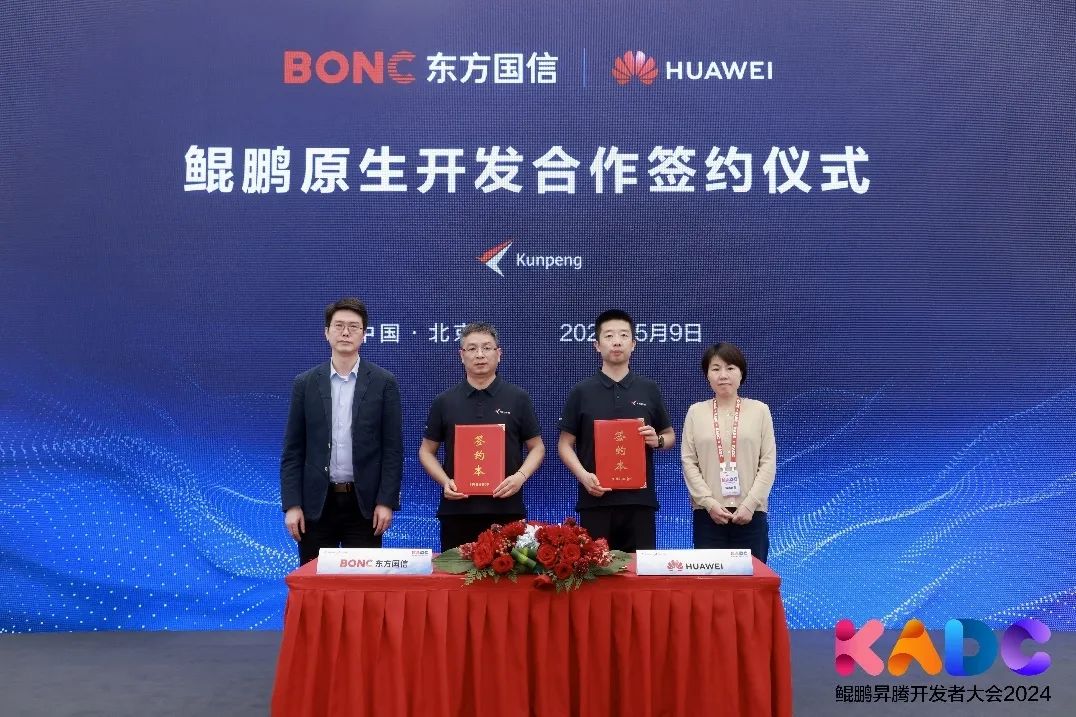 在鲲鹏开发者峰会上,作为首批签约合作伙伴,东方国信副总裁查礼,大数据事业部副总王虎,与鲲鹏计算质量与运营部部长颜叶、鲲鹏计算业务副总裁陈超共同签署了《东方国信&鲲鹏原生应用开发合作协议》,为双方的合作奠定了坚实的基础。东方国信通过积极参与原生开发,以通用算力和智能算力为基础,打造软硬生态协同,增强公司的核心竞争优势,提升原生开发能力及自主创新能力,加快数字化创新步伐。