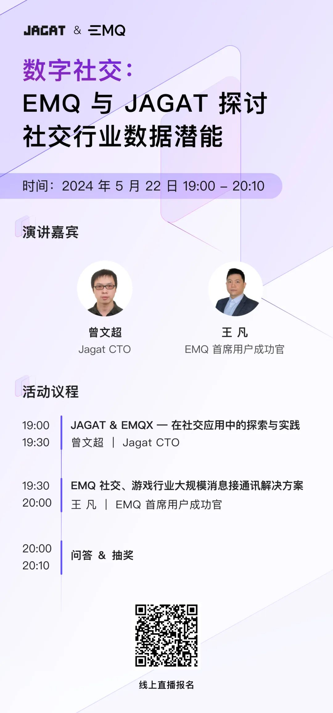 5 月 22 日 19 点 ,EMQ 将与 LBS 社交代表 JAGAT 共同举办线上研讨会,讨论 MQTT 技术在 LBS 社交软件数字化、智能化升级中的关键作用。