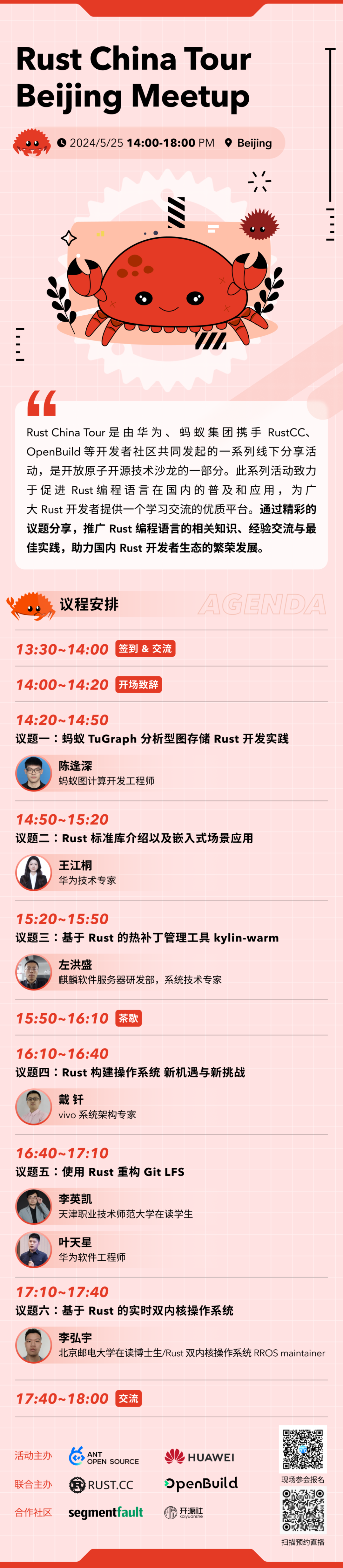 通过参与 Rust China Tour 的北京站活动,你将有机会与国内顶尖的 Rust 实践者面对面交流,共同探讨 Rust 编程语言的实践经验与未来发展。不论你是 Rust 新手还是资深开发者,这里都有你不可错过的学习与交流机会。期待在北京与你相见!