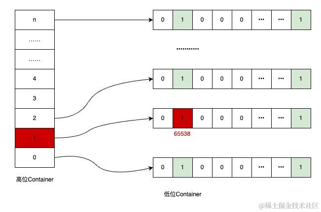 以整型int(32位)为例,将数据分成高16位和低16位两部分,低16位不变,作为数据位Container,高16位作为桶的编号Container,可以理解为高位的Container中,存放了很多个低位Container。