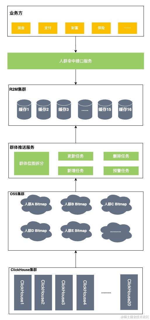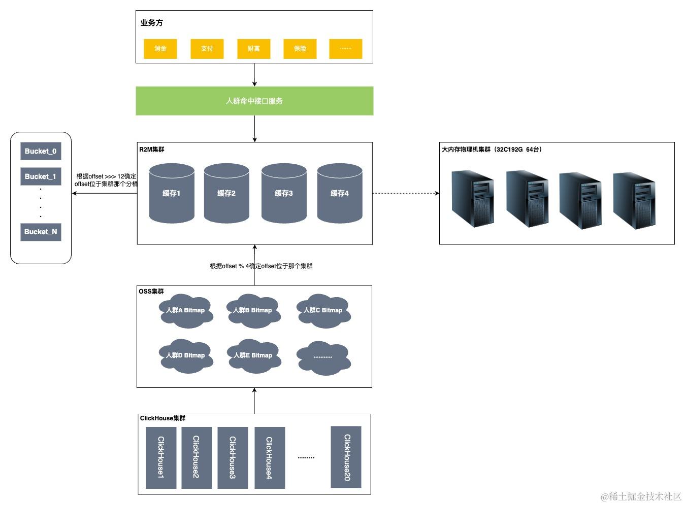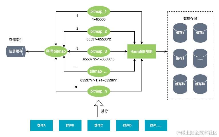 部署多个R2M集群(或分组),将群体bitmap进行拆分,并根据一定的路由策略存储到不同的集群上,通过不同的集群提供查询能力,如下图