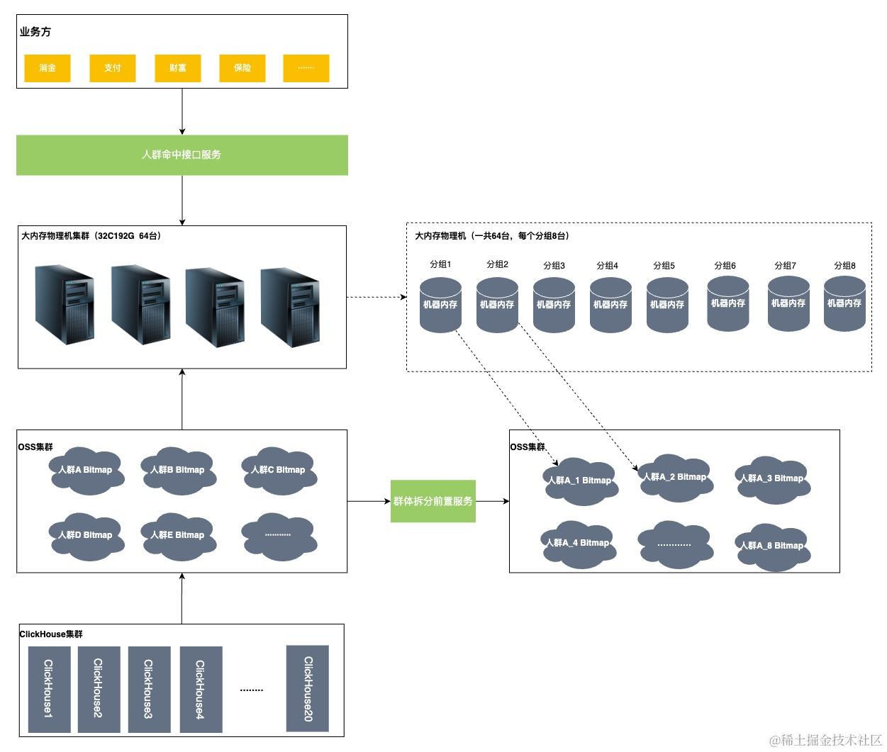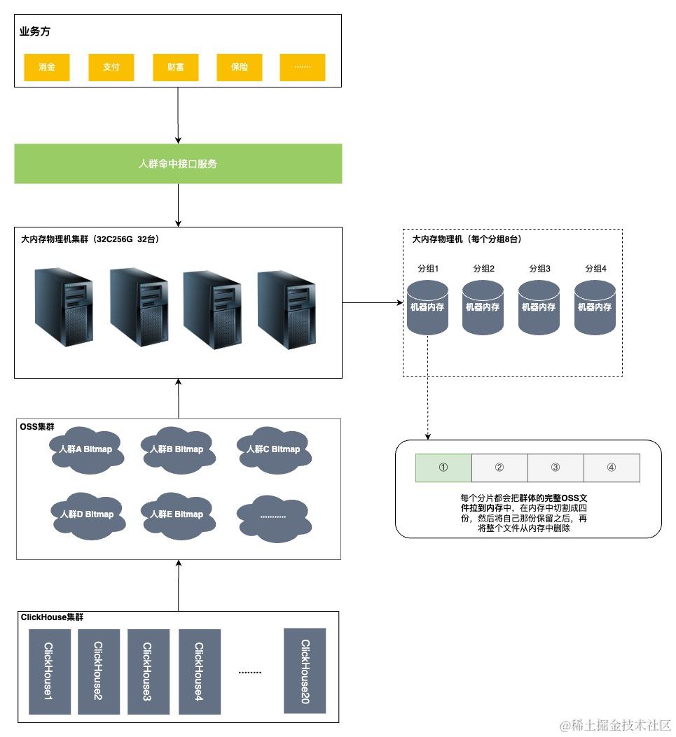 将人群数据从OSS拉取并存储在物理机(32C256G)中,由于群体数量过多,256G不足以将所有的群体的OSS文件都保存下来,所以采用分片的逻辑,每个分片只存储群体OSS文件的四分之一。