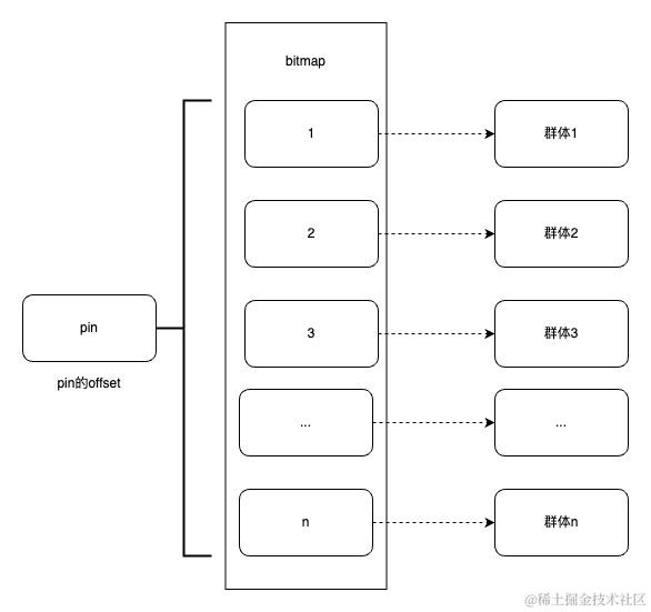 由于bitmap里只能存0或者1来标识当前位是否有值,而用户pin确是一个字符串,这就需要将数十亿的用户pin进行唯一性编码,这个编码也就是我们常说的offset偏移量。