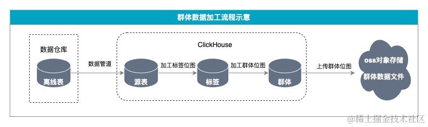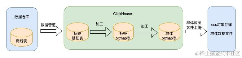 基于上面对bitmap以及clickhouse的介绍,我们采用的是ClickHouse+Bitmap实现标签群体组合计算和群体的存储