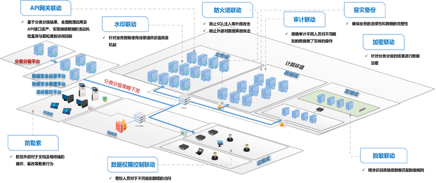 在数据分类分级实施成果及“知风险”的基础上,建立全方位的数据安全技术能力。基于数据分类分级结果,以联动策略为牵引,建立以风险管理为导向的全域、动态的安全联动防御机制。
