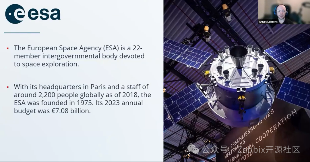 欧洲航天局(ESA)是一个由22个成员国组成的政府间组织,致力于太空探索。总部设在巴黎,全球员工约2200人,ESA成立于1975年。其2023年的年度预算为70.8亿欧元。