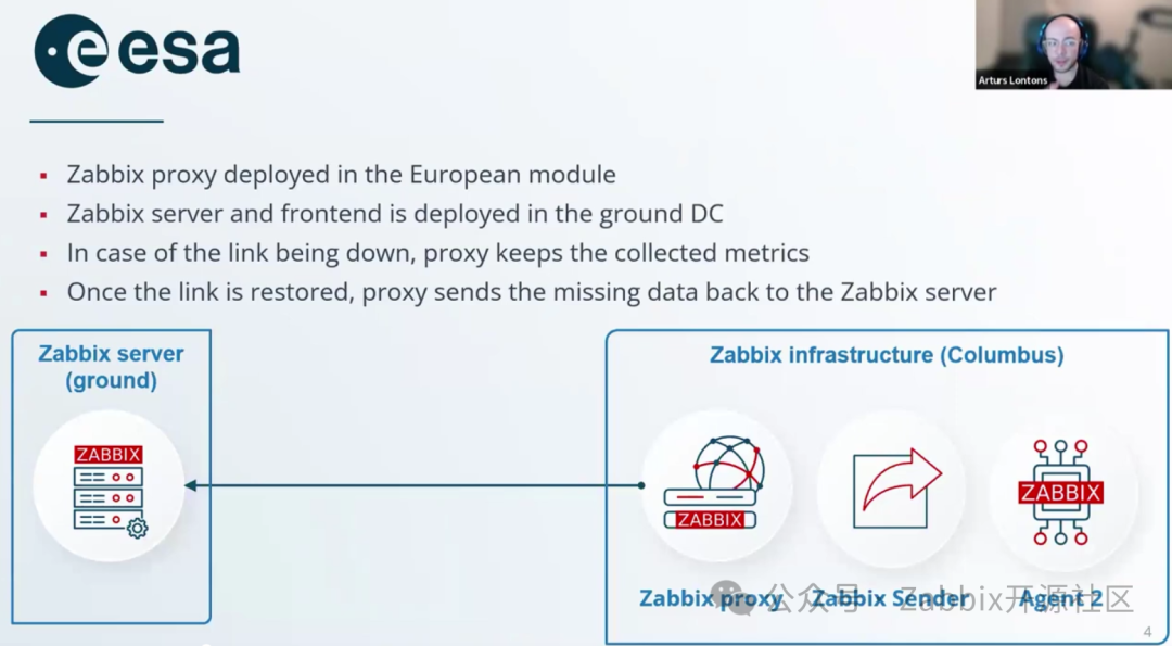 ESA还发现Zabbix proxy是他们需求的理想解决方案,因为如果地面数据中心与哥伦布模块之间的连接中断, proxy会继续收集本地指标,将其存储在自己的数据库中,然后在连接恢复后将其发送回地面。尽管尚未出现这种情况,但在所有测试场景中Zabbix都表现出色。