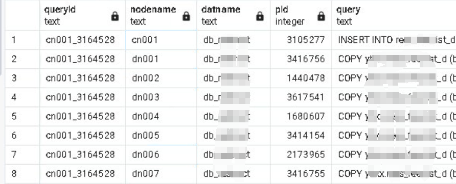 其中同一个 Query 在不同的 CN 以及 DN 上有相同的 queryid,其中列 query 可以表示 CN 或 DN 上正在执行的查询或者查询片段。