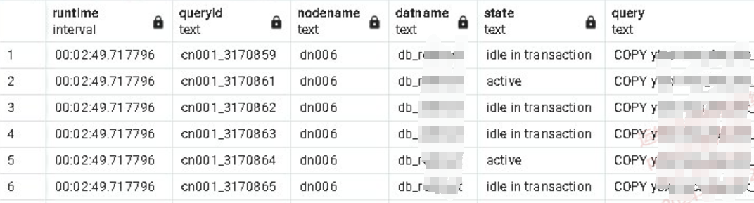 select current_timestamp - query_start as runtime,queryid, nodename, datname, state, queryfrom pg_stat_cluster_activitywhere state != 'idle' and query <> ''order by runtime desc;