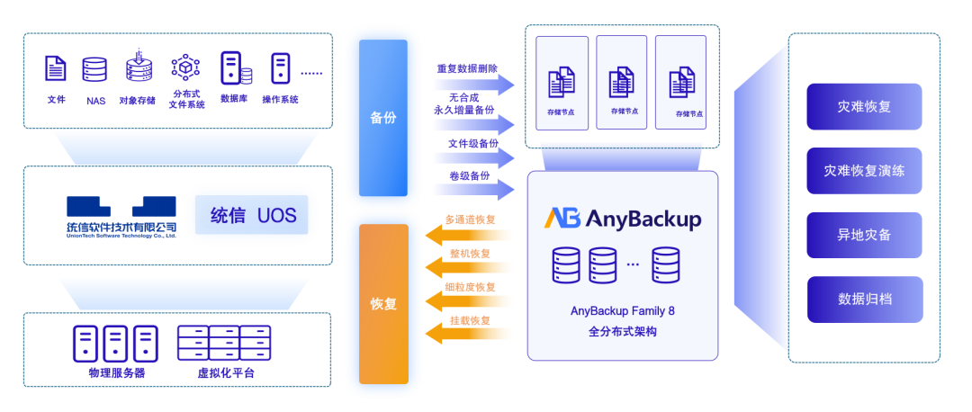 作为数据保护与管理的引领者,爱数 AnyBackup 多年来持续聚焦客户场景需求,与广大生态伙伴积极合作。此次携手,爱数与统信软件深度共融共创,推出业内领先的AnyBackup Family 8 统信UOS 数据保护方案,打造更安全可靠、自主可控的数据底座,实现快速、高效、精准的操作系统及文件数据备份恢复,为业务数据与用户信息资产带来全面的安全保障,助力信创国产化建设。