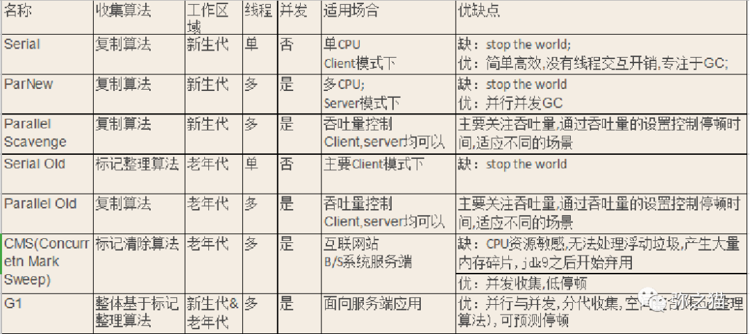 用于老年代的收集器有三种,它们基于不同的垃圾回收算法。Serial Old不用说,还是单CPU场景。Prallel Old,Prallel Scavenge的老年代版本,也不再多说。CMS,在JDK7开始这种被长使用,直到JDK9开始才慢慢被G1取代,它的有点很明显低停顿高性能的优点。