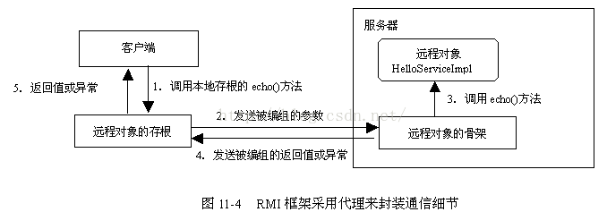 RMI框架采用代理来负责客户与远程对象之间通过Socket进行通信的细节。RMI框架为远程对象分别生成了客户端代理和服务器端代理。位于客户端的代理类称为存根(Stub),位于服务器端的代理类称为骨架(Skeleton)。stub(存根)和skeleton( 骨架 ) 在RMI中充当代理角色,在现实开发中主要是用来隐藏系统和网络的的差异, 这一部分的功能在RMI开发中对程序员是透明的。Stub为客户端编码远程命令并把他们发送到服务器。而Skeleton则是把远程命令解码,调用服务端的远程对象的方法,把结果在编码发给stub,然后stub再解码返回调用结果给客户端。