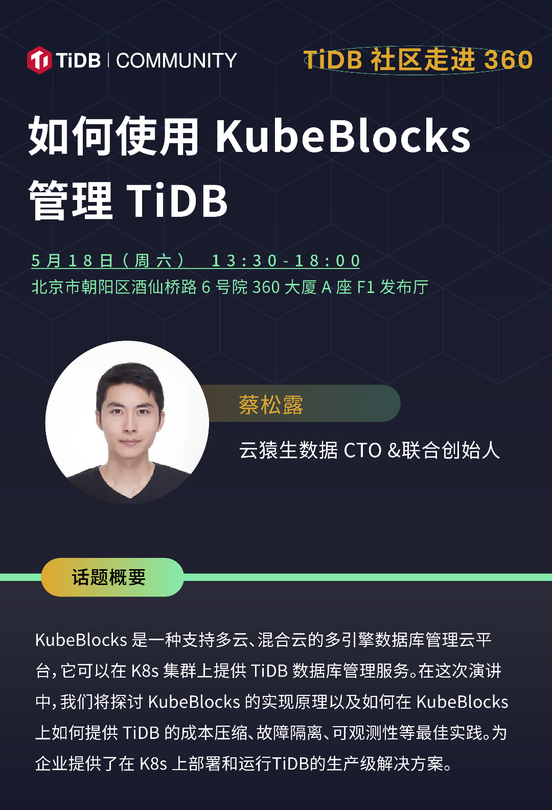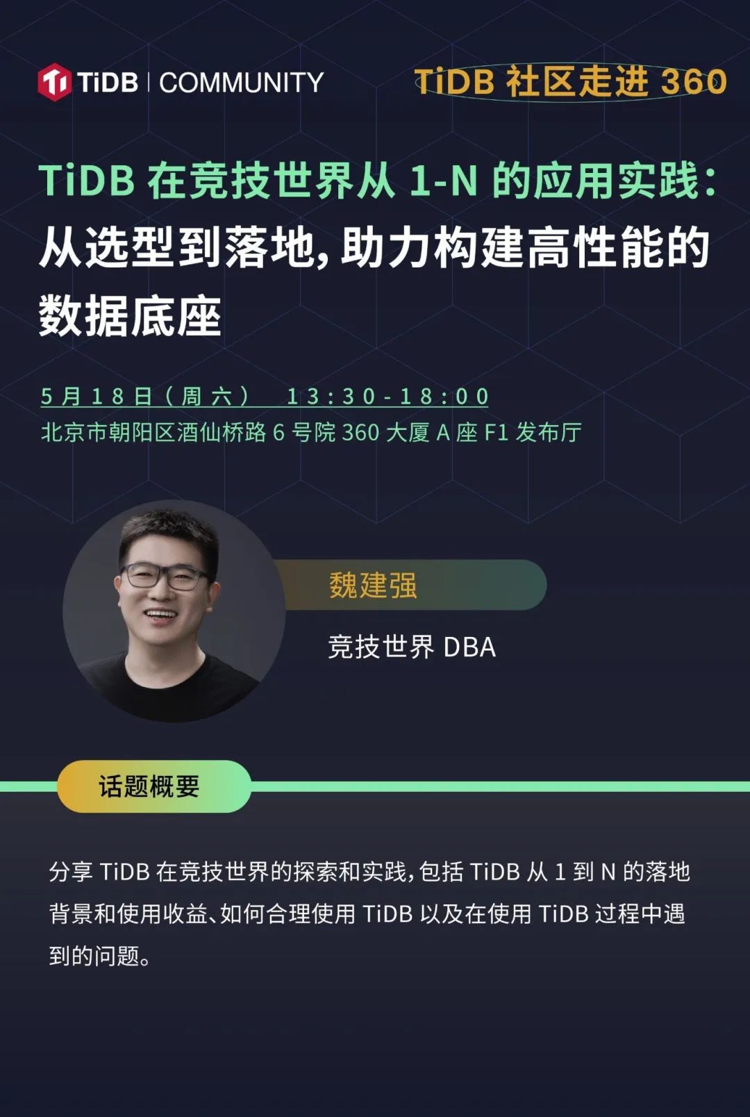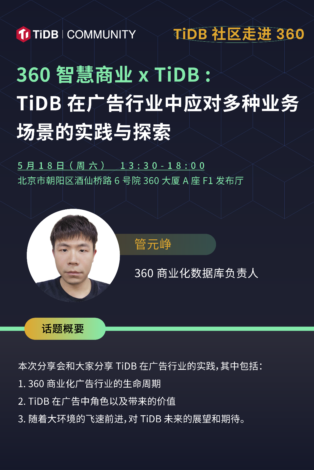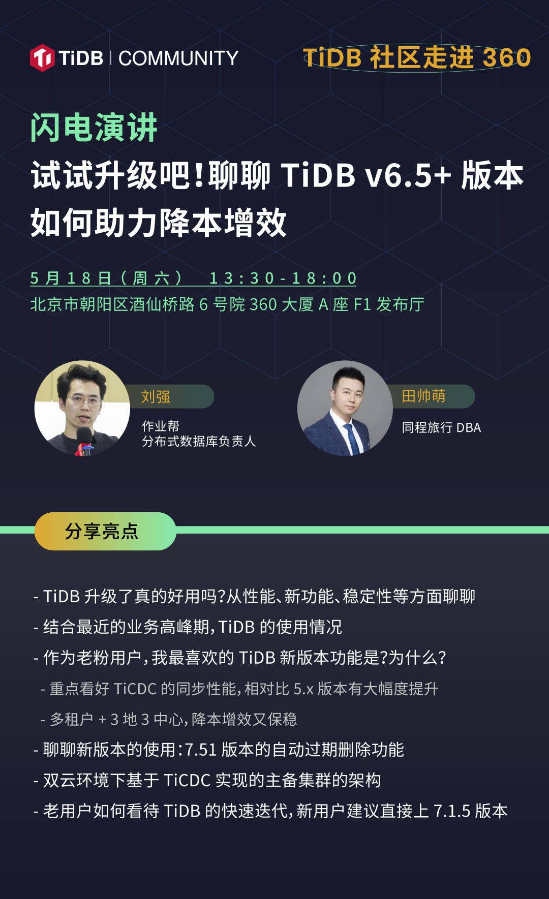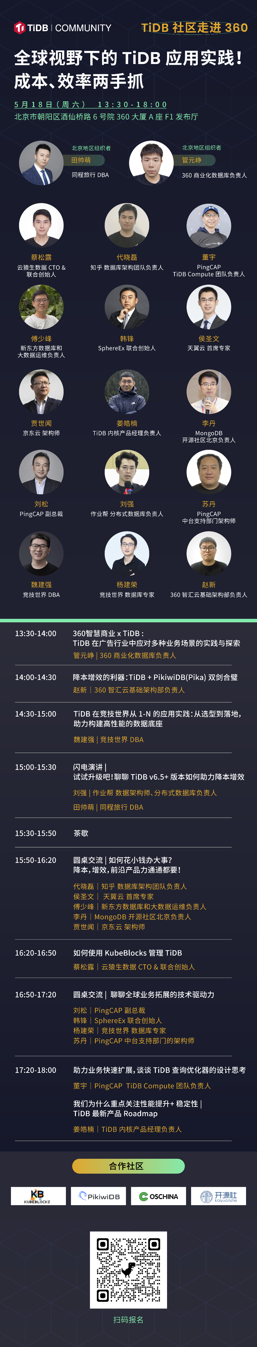 🔥 新一期 TiDB 地区交流活动又如期而至啦!这一次,我们走进 360!首先感谢北京地区组织者田帅萌老师和管元峥老师,邀请了超多 TiDB 社区的资深大佬来给大家分享 TiDB 降本增效的实践方案、大家都在关注的“技术出海架构”的前沿经验、还有 TiDB 生态圈的开发实践以及最新的 TiDB Roadmap、TiDB 查询优化器的设计思考!超级建议大家都来听听!线下参会还有超可爱的宇航员手机支架可领!