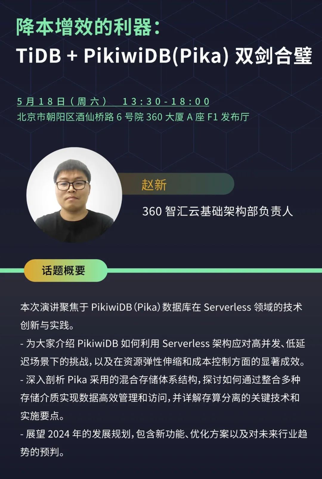 生态开发实践分享:从 KubeBlocks 创始人及 PikiwiDB(Pika) 社区负责人的演讲中你获得 KubeBlocks+ TiDB Pika + TiDB 的最佳实践,包括如何利用 Serverless 架构应对高并发、低延迟场景下的挑战,看TiDB + PikiwiDB(Pika) 如何双剑合璧!