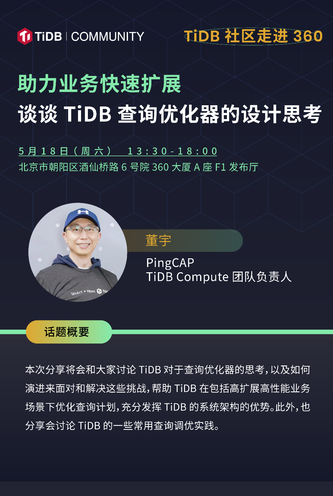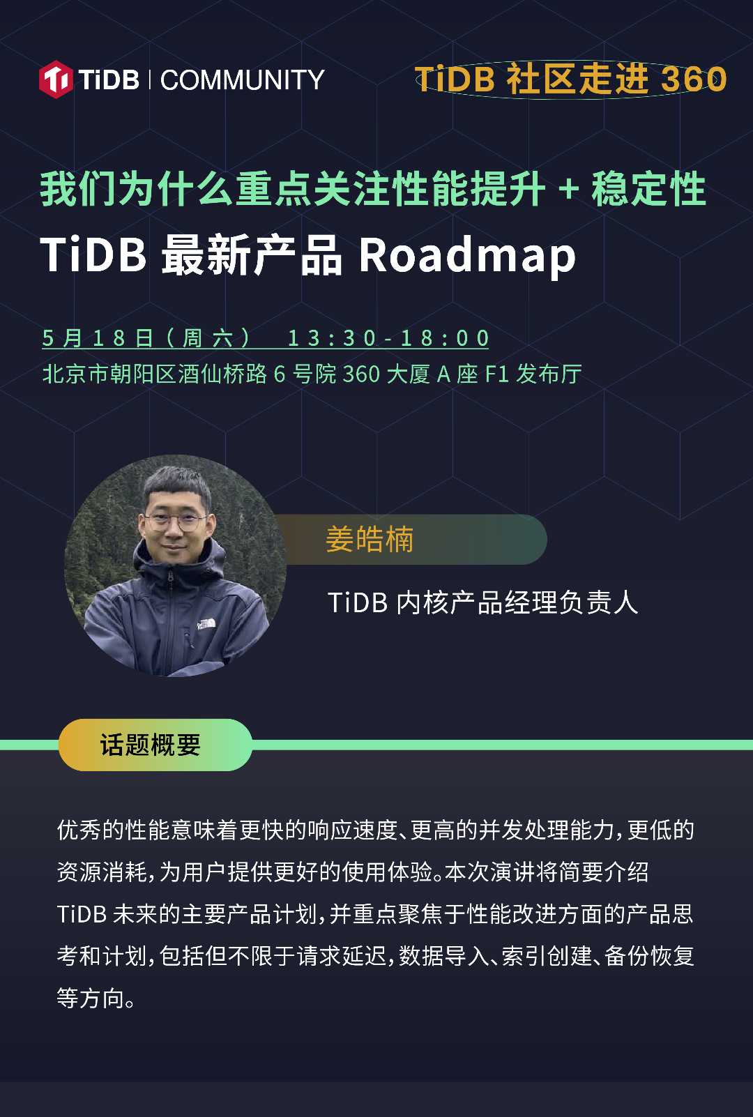 TiDB 产品发展思考及未来计划:作为中度至重度的 TiDB 用户,可以了解 TiDB 在未来一年的最新产品发展计划,以及 PingCAP 内核产品经理 Eason 关于 TiDB 减少新功能开发,转而更关注性能和稳定性提升的策略和尝试;听 TiDB Compute 团队负责人董宇老师聊聊TiDB 查询优化器的设计思考。