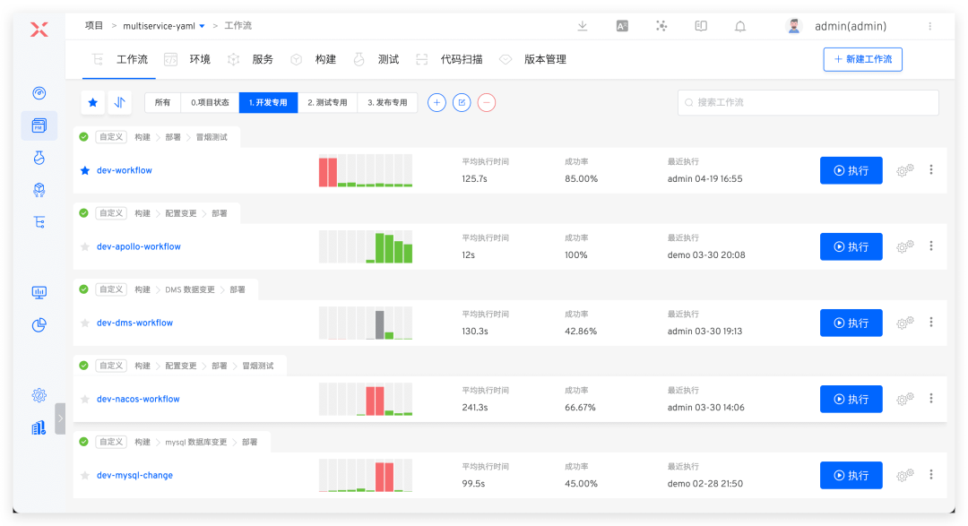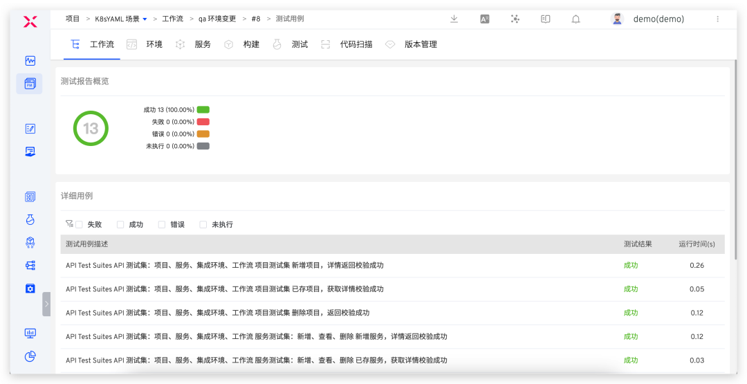 ● 自动化构建、部署和测试任务最近 30 天的运行情况以及总运行次数和成功率。