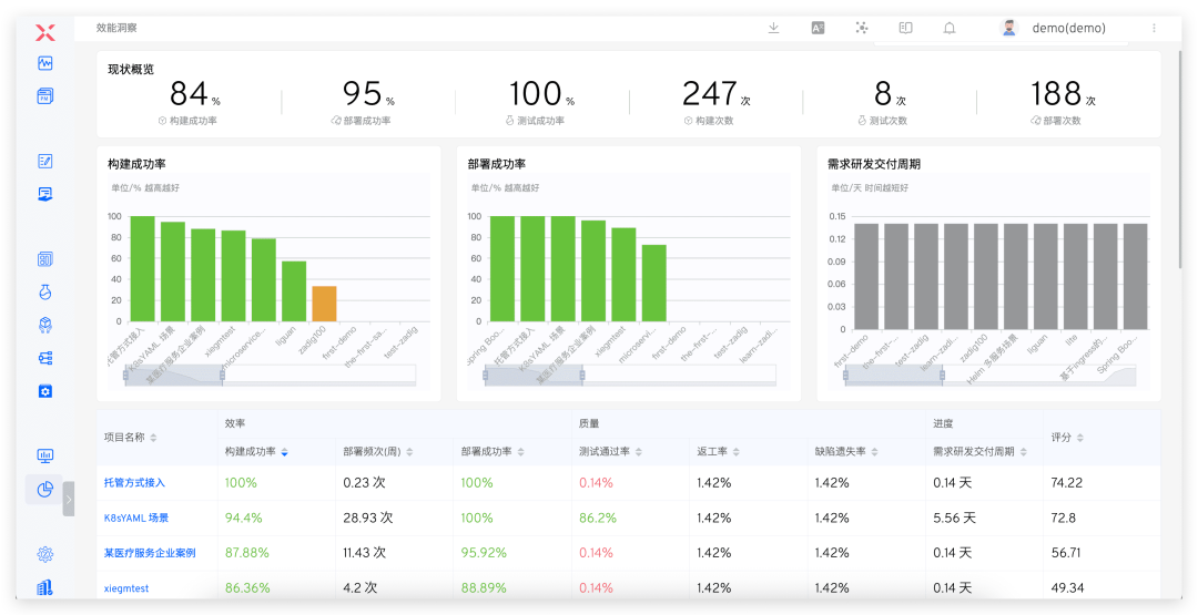 访问 Zadig 数据视图 -> 效能洞察,还可以从效率、质量和进度对项目进行预览,查看服务的构建、部署、测试数据,帮助分析各个环节的变化过程以及效能短板。