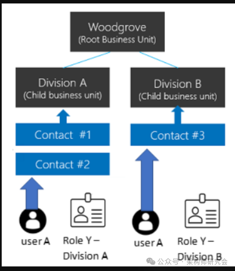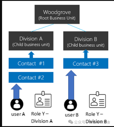 用户A与部门A相关联,并从部门A分配了一个安全角色Y。这允许用户A访问联系人#1和联系人#2记录。而部门B中的用户B不能访问部门A的联系人记录,但可以访问联系人#3记录。