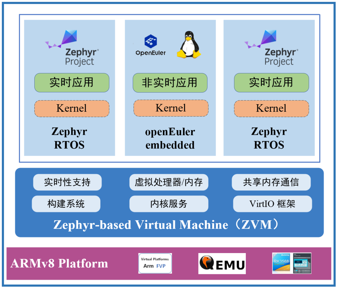 ZVM 是一款基于著名开源实时操作系统 Zephyr 结合硬件辅助虚拟化技术的嵌入式实时虚拟机,支持包含 Linux、实时操作系统和 baremetal 程序在内的多个运行时混合部署以及混合关键性调度。
