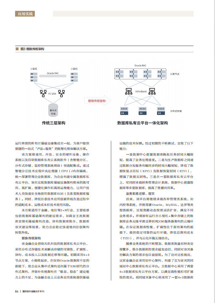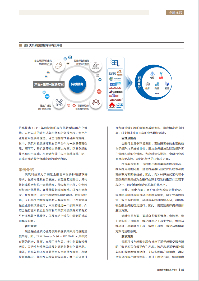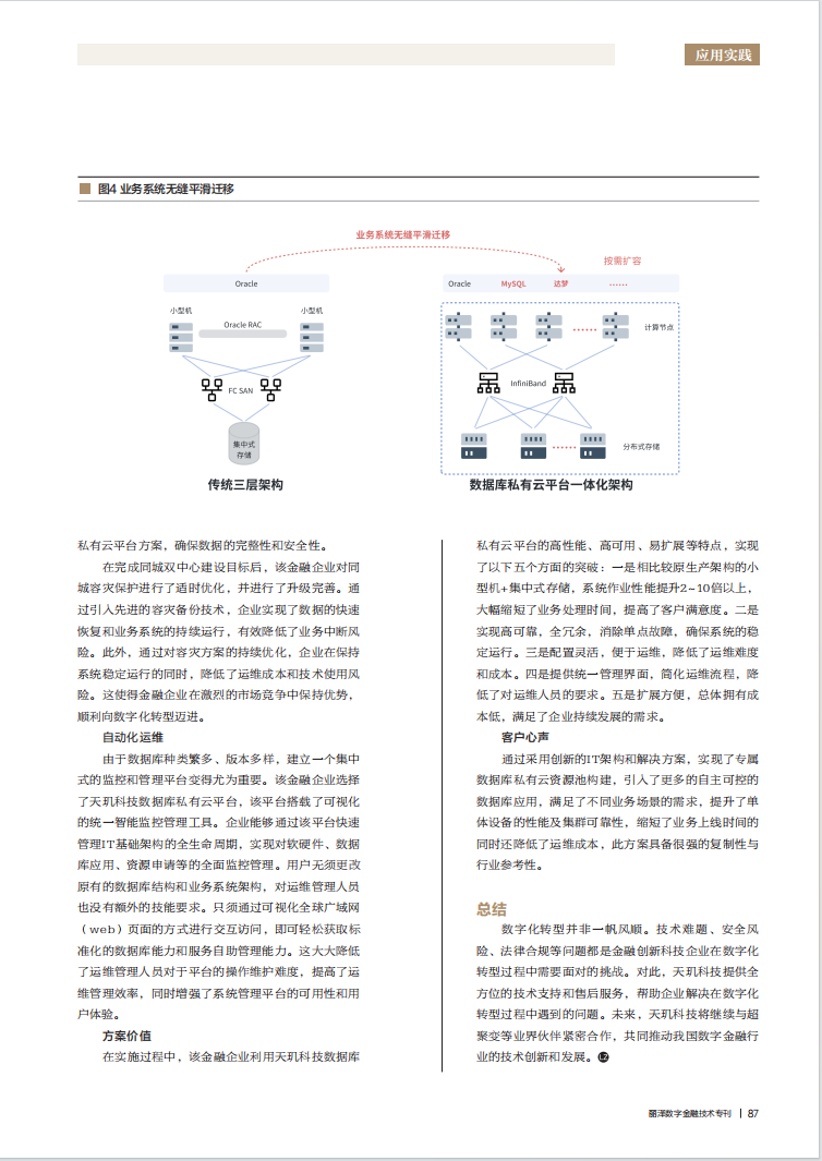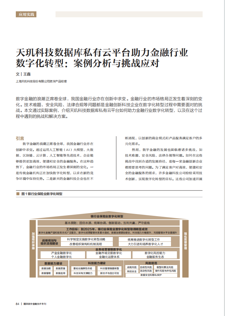 近日,《丽泽数字金融技术专刊》第5期重要版面刊登了天玑科技资深产品经理王鑫署名文章——《天玑科技数据库私有云平台助力金融行业数字化转型:案例分析与挑战应对》。文章从金融行业市场格局的变化切入,阐述了数字金融发展面临的诸多困境,并从天玑科技的应对解决方案中,分析其中的转型思路和技术实现途径,为金融行业数字化转型发展贡献一份天玑力量……
