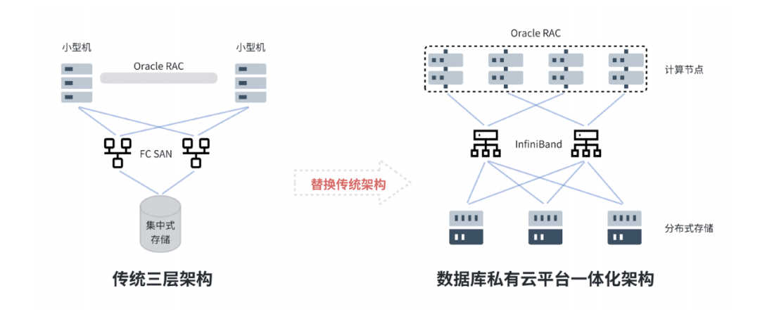 某金融企业核心业务交易系统长期采用传统的三层架构,即,IBM Power/x86 + FC SAN + 集中式存储的组合。然而,在使用多年后,该企业面临设备老旧、灵活性与性能无法及时满足业务变化等问题。此外,传统架构还存在着使用专用硬件及网络、存储控制器集中、架构及运维复杂等问题。客户希望通过开发可持续扩展的数据库基础架构,彻底解决现有问题,以支撑未来3~5年的业务增长需求。